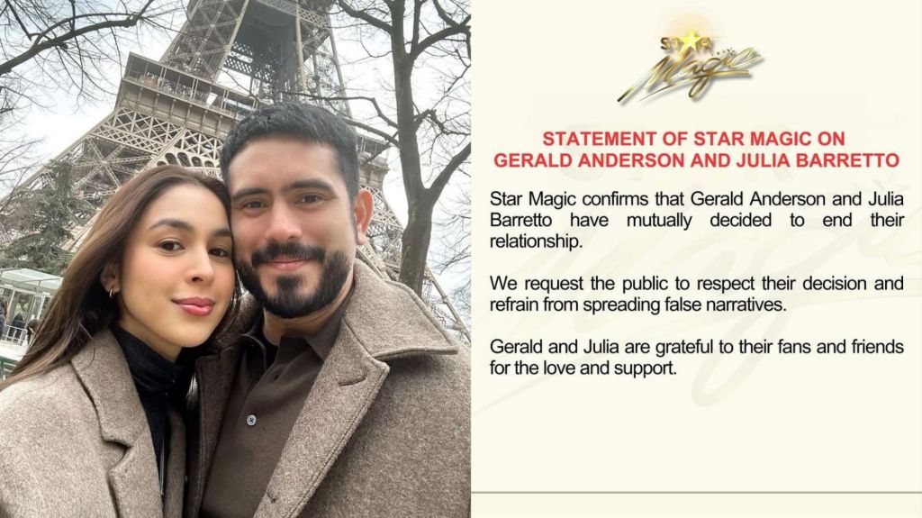 Gerald Anderson and Julia Barretto have officially ended their relationship, talent agency Star Magic confirmed.